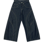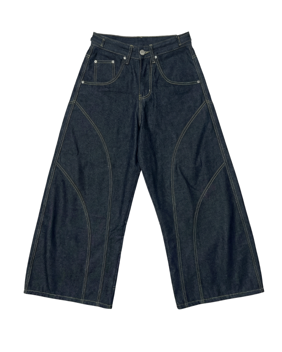 The Curved Faultline Denim Jeans are defined by precision paneling that traces the leg like tectonic lines. Each seam is intentionally placed to create depth, structure, and subtle curvature through the silhouette.